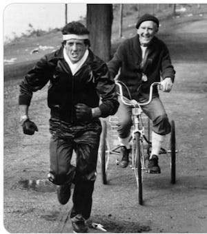 Although it immediately reminded me of a near-70-year-old Burgess Meredith training Rocky by biking alongside him, the owners’ situation and motivation were more mysterious.