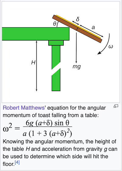 I was dazzled to learn that not only did Robert Matthews, an Oxford physicist, determine the calculation for which side would hit the floor based on the height of the table and the angular momentum, he also won an award for this work.